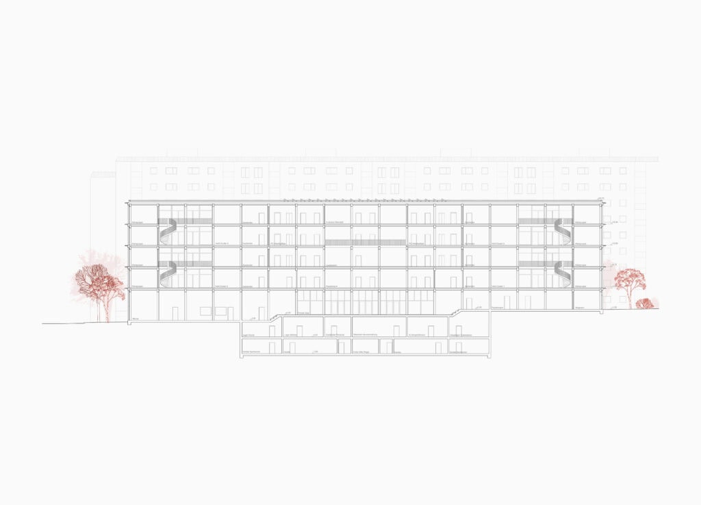 Am Schulstandort in der Knöllgasse in 1100 Wien werden derzeit 430 Kinder in 19 Klassen in einer offen geführten Volksschule (OVS) unterrichtet. Ziel der Planungsaufgabe für diesen Bauplatz ist die Erweiterung des Standortes um eine neue Mittelschule für etwa 400 Schüler:innen. Besonderes Augenmerk liegt auf der Berücksichtigung zeitgemäßer pädagogischer Konzepte und geänderter Nutzungsanforderungen wie z. B. die Nachmittagsbetreuung oder das Lernen in Kleingruppen. Holz mit seinen haptischen, atmosphärischen und olfaktorischen Qualitäten ist als Material bestens dafür geeignet, Bildungsbauten mit guter Lernatmosphäre zu schaffen und aus der Schule einen Raum des Erforschens und Erfahrens zu machen. Hinzu kommen weitere Vorteile des modernen Holzbaus, die es geschickt zu nutzen gilt, wie z.B. der hohe Grad an Standardisierung und Vorfertigung bis hin zum Raummodul, die damit verbundenen kurzen Bauzeiten, geringes Gewicht, geringer Platzbedarf und trockene Baustellenführung mit Anlieferung und Montage just in time.